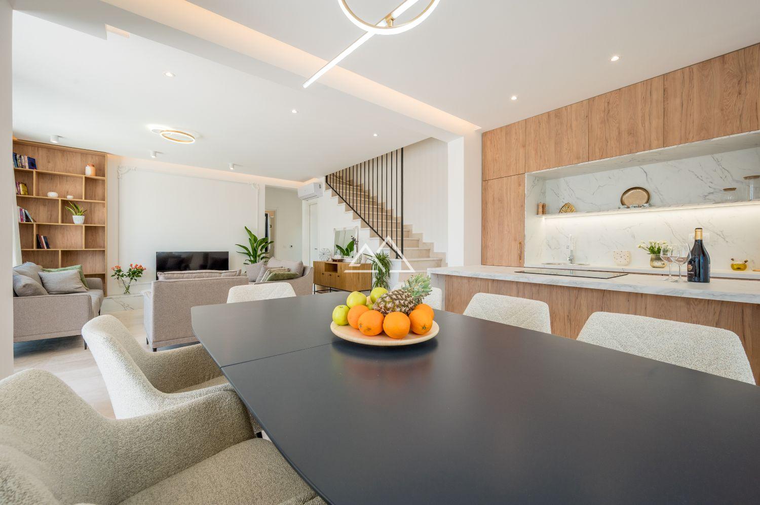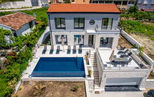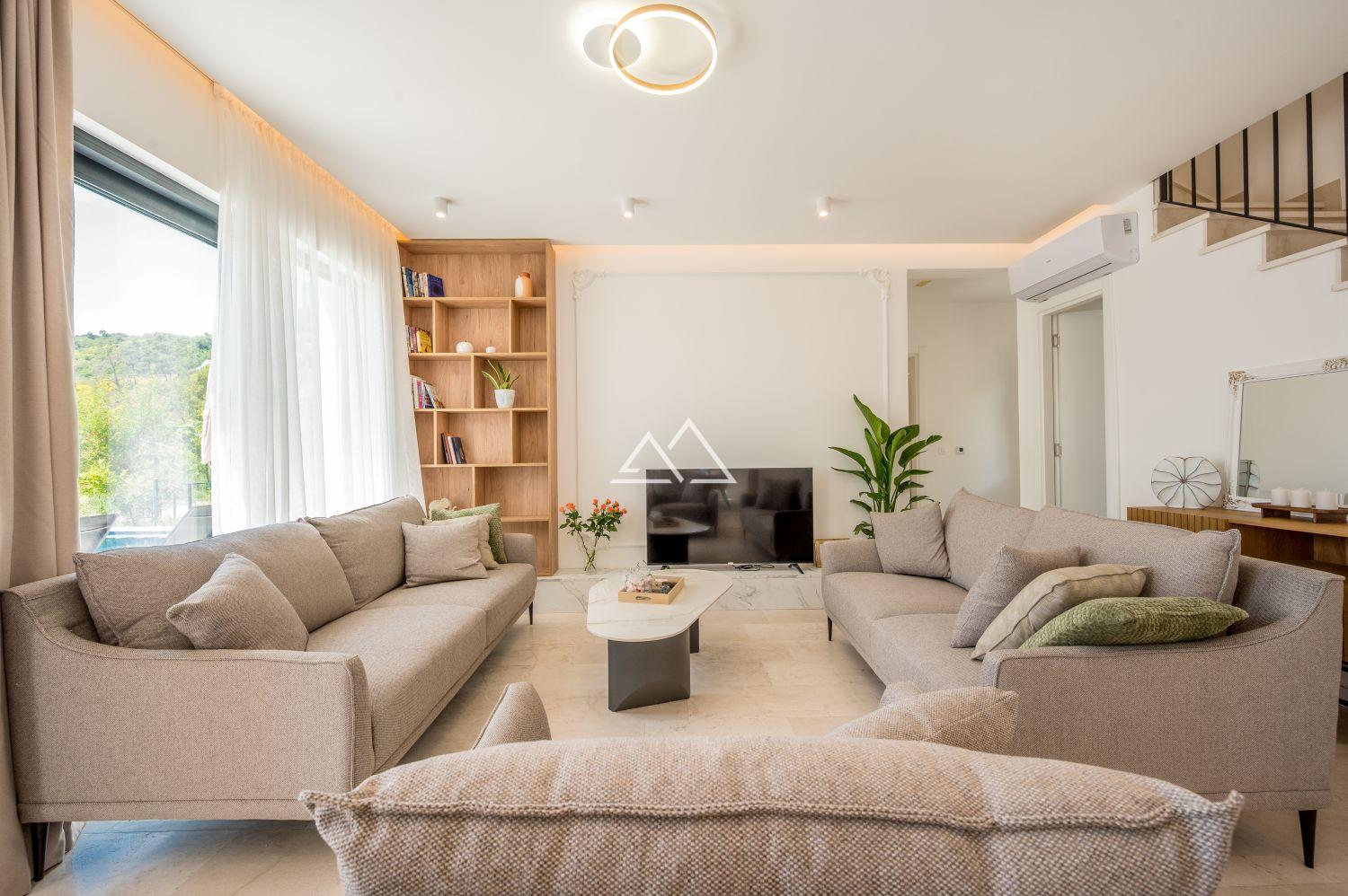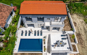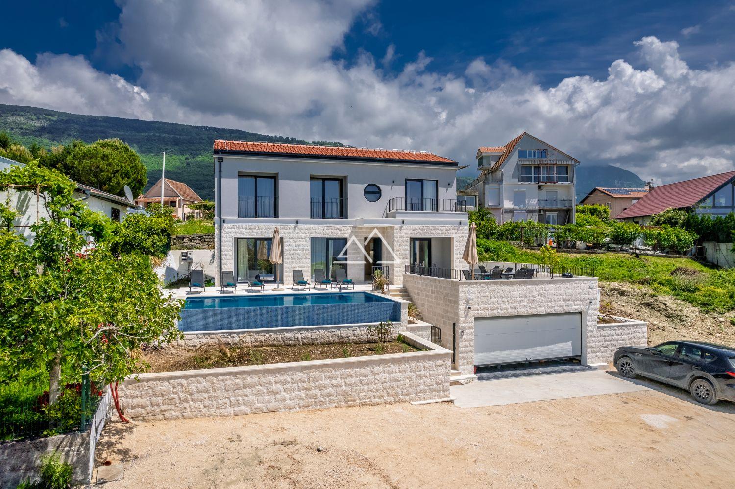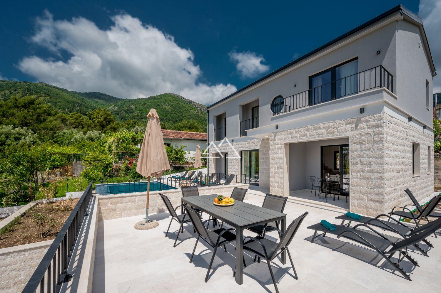 A modern two-story villa with a swimming pool, garage, and spacious plot located in the peaceful area of Mrčevac, Tivat. Just a 5-minute drive to the airport and 10 minutes to the city center and Porto Montenegro.