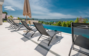 The villa features a spacious living room with access to a terrace and panoramic sea views, a modern kitchen, dining area, and pantry. It also includes underfloor heating and a central boiler. All necessary technical systems are installed, including video surveillance and automatic gates.