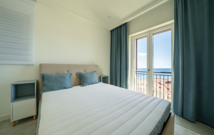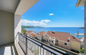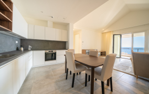 The apartment features a spacious living room combined with a modern kitchen, opening onto a large private terrace with panoramic sea views. It includes one bedroom, a bathroom, and a utility room. All windows offer stunning views of the Adriatic Sea.
