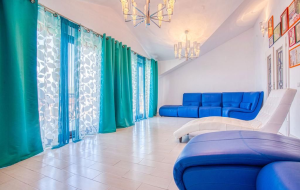 • Second living room with sofas and access to a spacious balcony with panoramic views of the sea and old town.