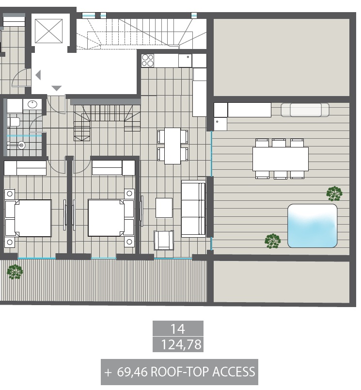• Layout: hallway, open-plan living room and kitchen, 2 bedrooms, bathroom, terrace, and green terrace