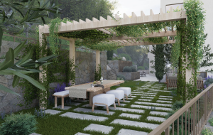 • Mediterranean garden with lavender, rosemary, olive, and cypress trees.
