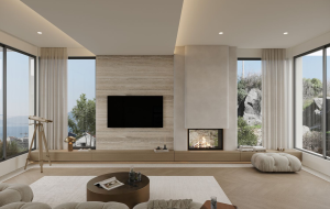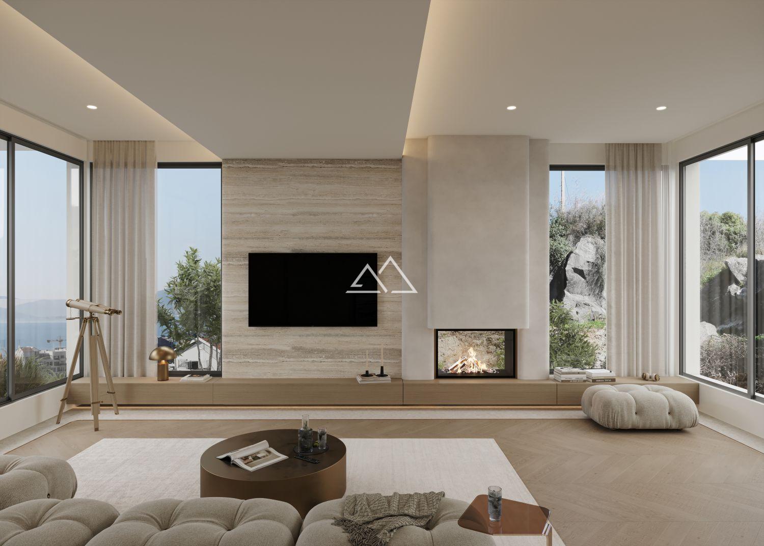 • Living room with a double-sided glass fireplace visible both indoors and from the terrace