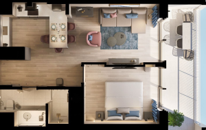 Examples of a two-bedroom apartment, a one-bedroom apartment with a sea view, and a one-bedroom apartment with a mountain view can be found via the links.