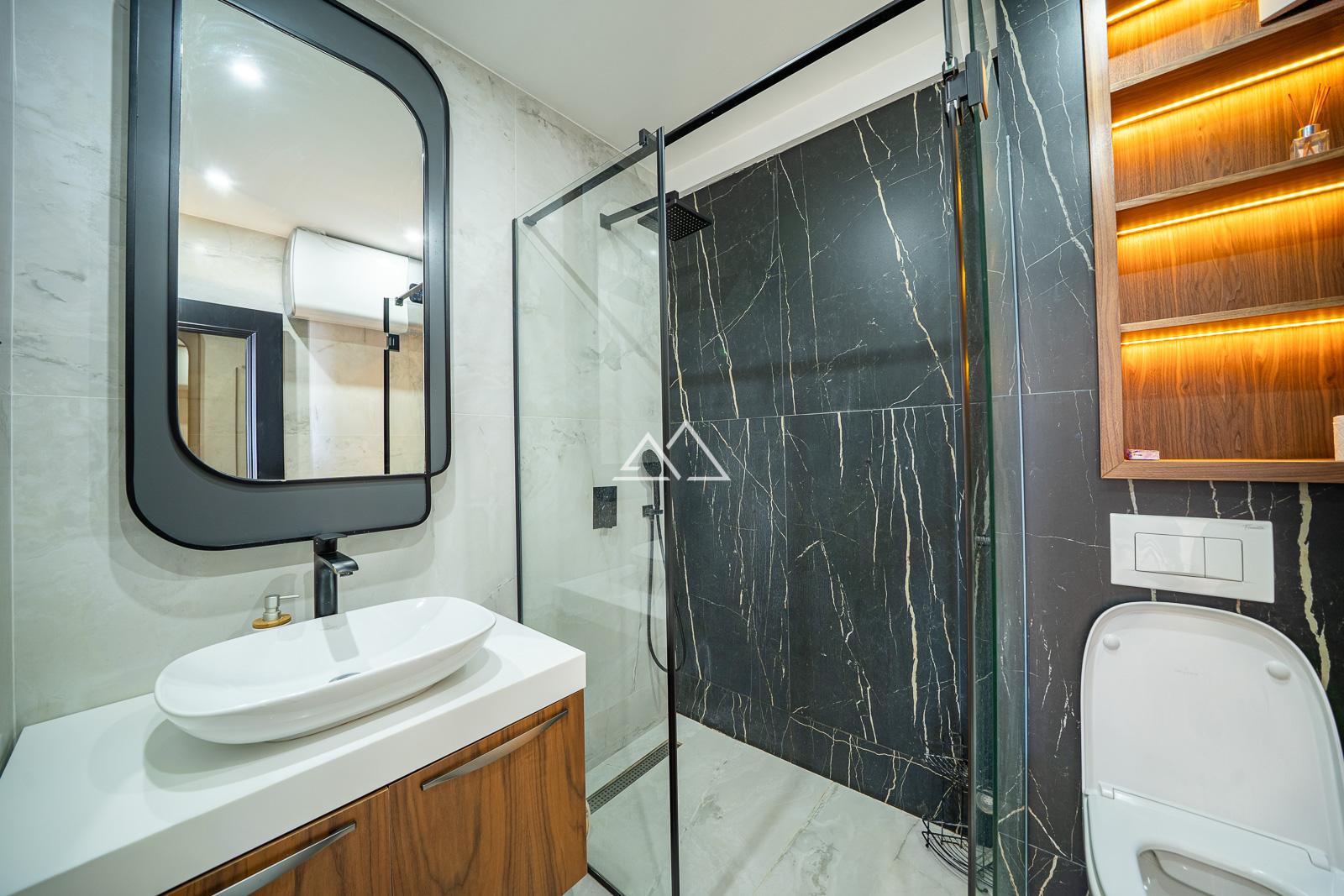 The interior is finished in a modern style with high-quality materials. Smart zoning highlights the space and natural light. From the windows and the terrace, there are partial views of the sea and mountains.