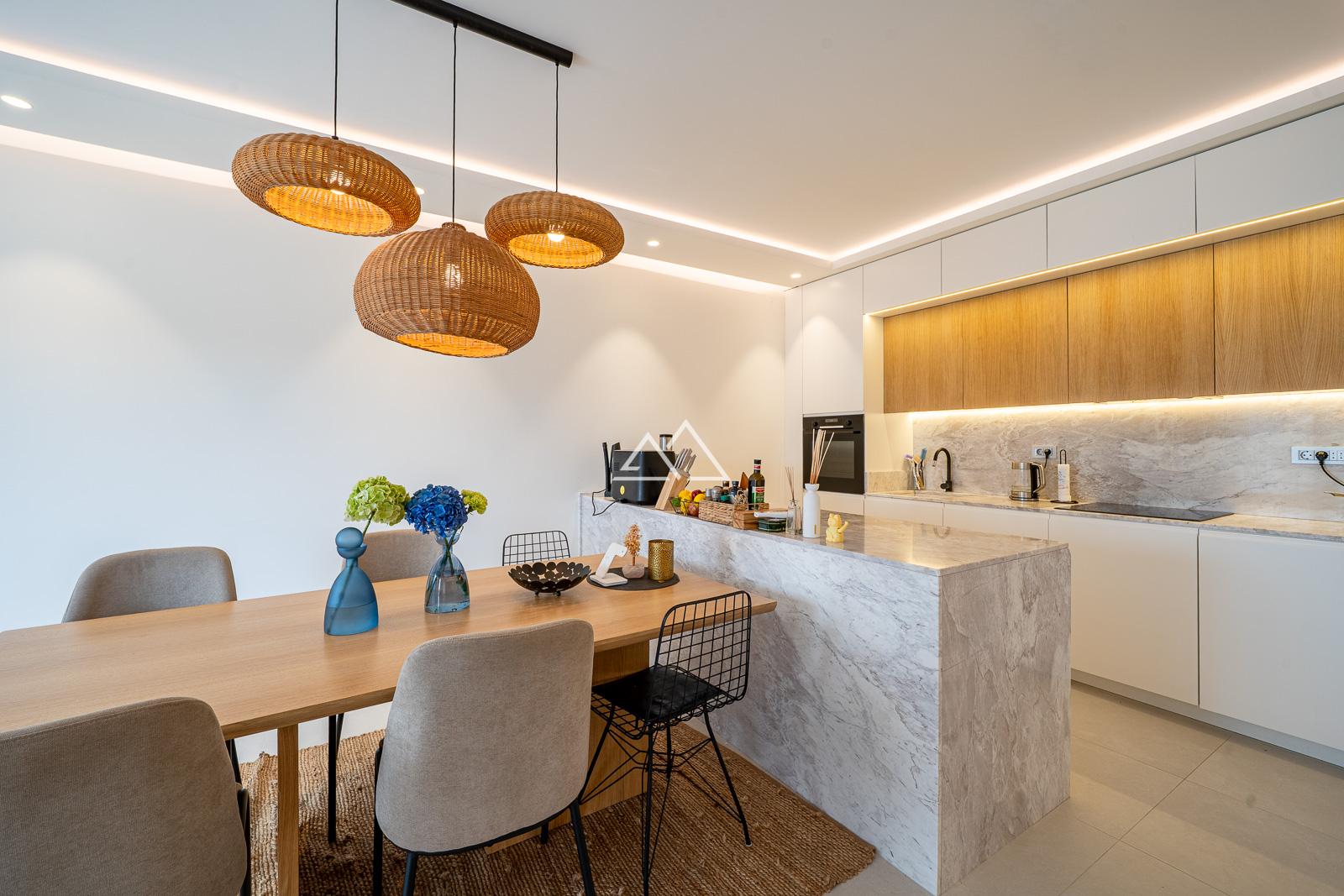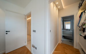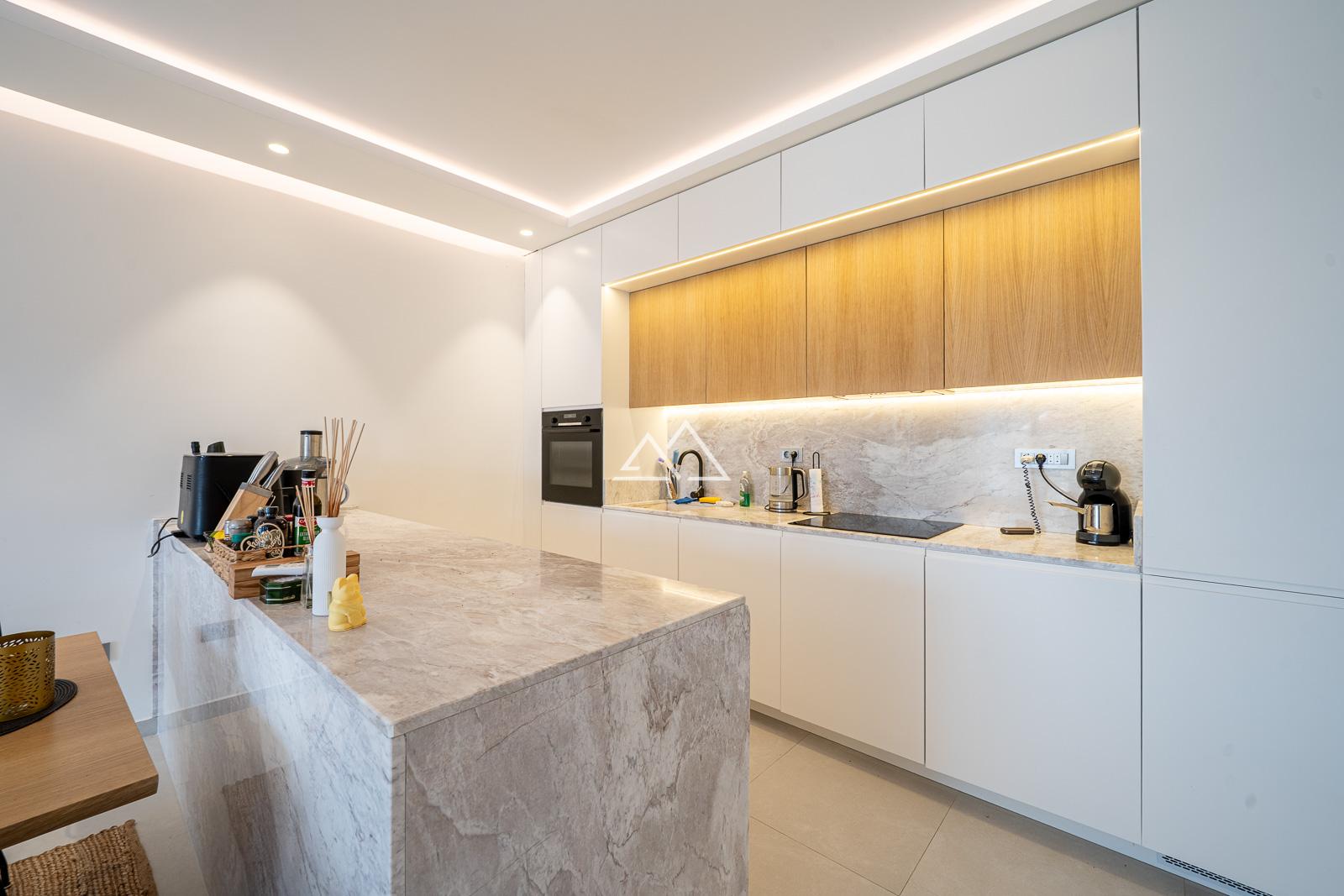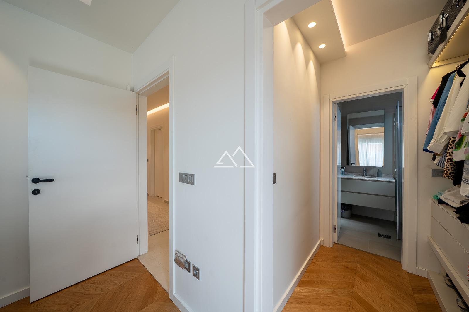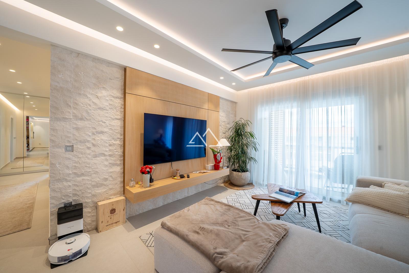 The bright and airy living room with an open-plan kitchen and access to the terrace creates a cozy space for relaxation. The apartment features two large bedrooms, two bathrooms, two walk-in closets, a spacious hallway, and a separate utility room — an ideal layout for a family. The apartment is fully equipped with modern appliances and ready to move in.