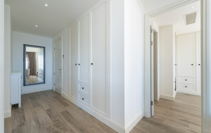 high ceilings, two elegant bedrooms, the master with a direct sea view, two contemporary bathrooms, a fully equipped open-plan kitchen and dining area, and a large terrace offering a stunning panoramic view of the marina and the open sea underfloor heating throughout the apartment.