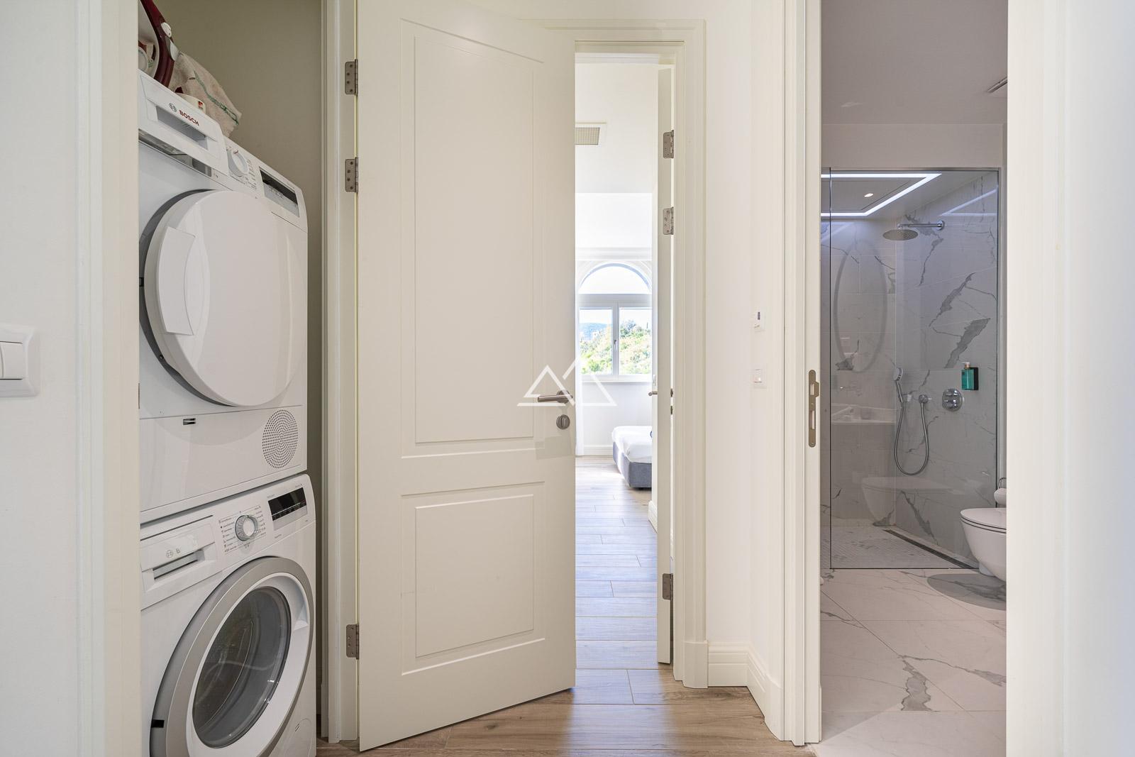 This stylish two-bedroom apartment includes: a spacious living area with floor-to-ceiling windows opening onto the terrace,