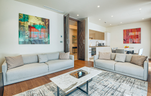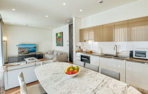- Highly functional layout: a bright and spacious living room with terrace access and a kitchen on one side — and two bedrooms with two bathrooms on the other