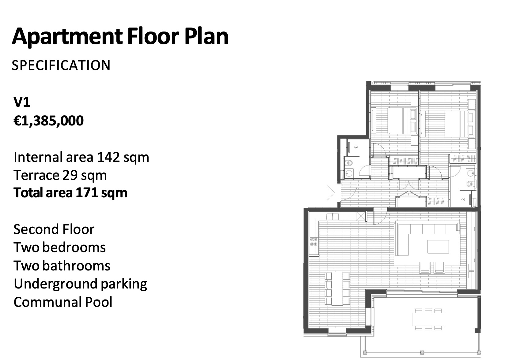 – A well-designed and functional layout: on one side, a spacious and light-filled living room with access to a terrace and a kitchen area; on the other side, two private bedrooms, each with its own en-suite bathroom.