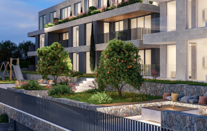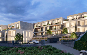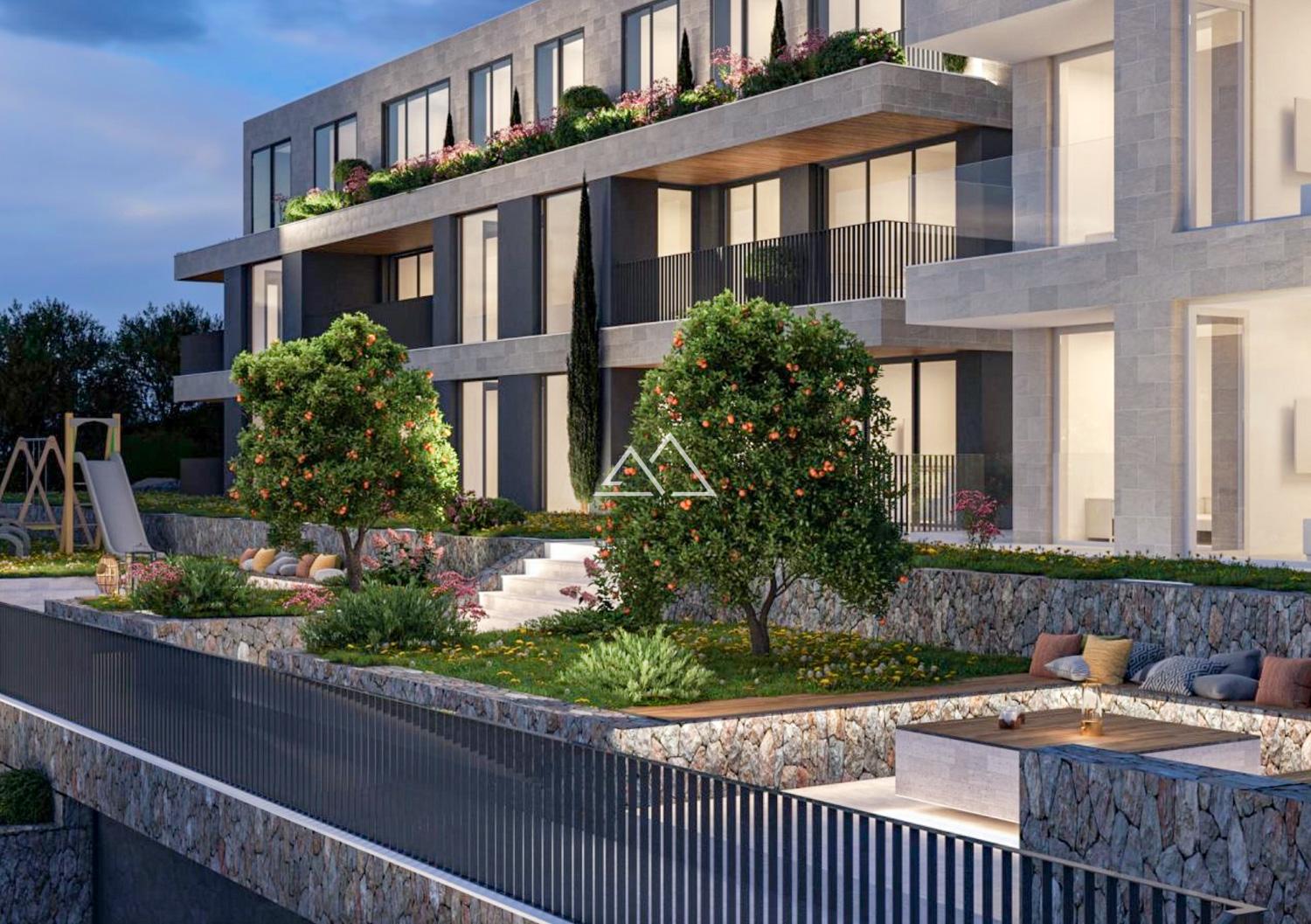 The complex comprises two modern buildings with panoramic windows and terraces, offering breathtaking views of the Old Town of Kotor and the Bay of Kotor. The courtyard features a relaxation area and a children’s playground.
