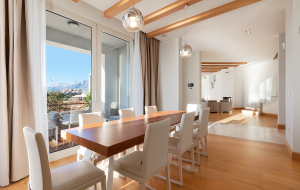 • Elegant dining area and kitchen with access to a covered terrace surrounded by flower gardens