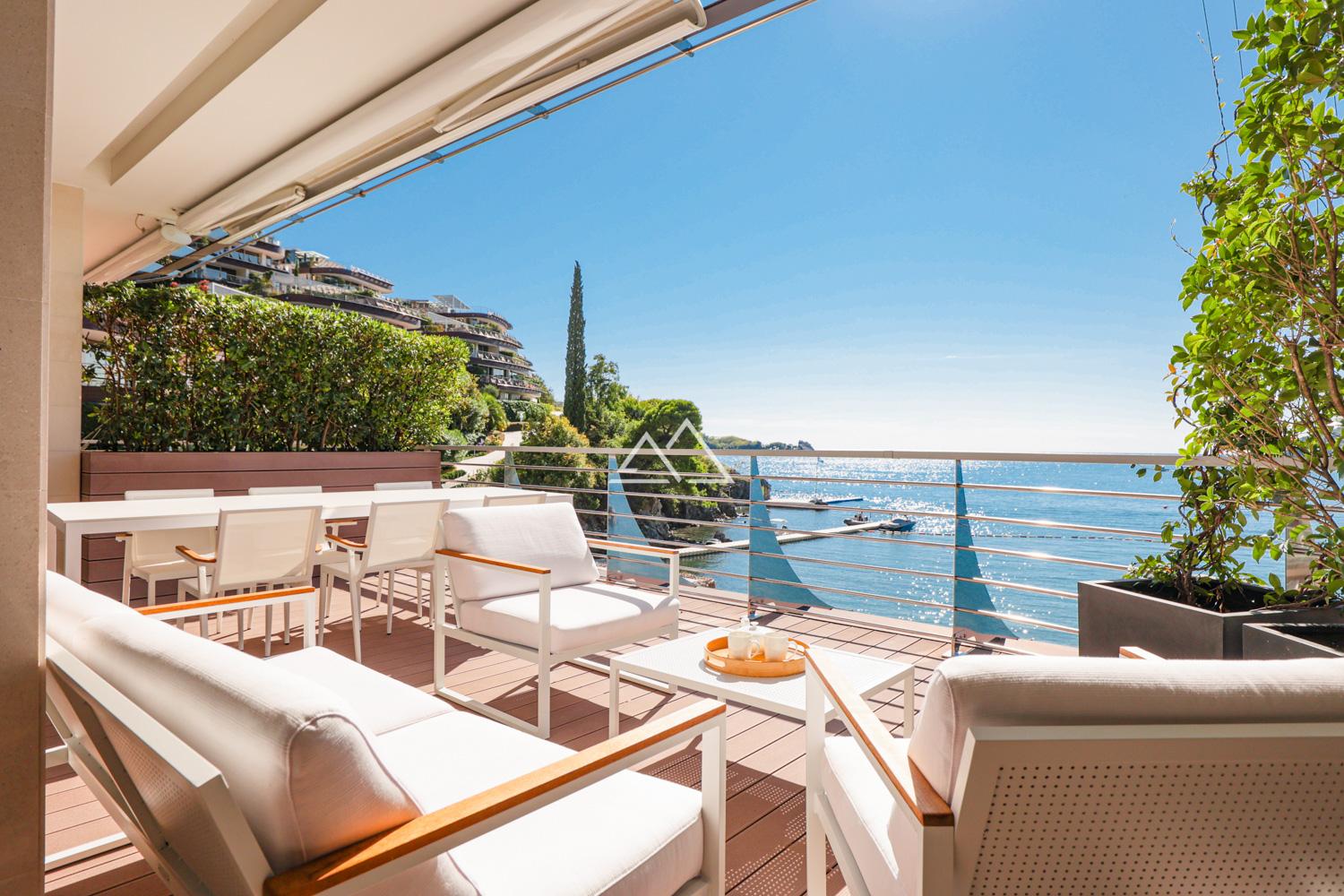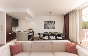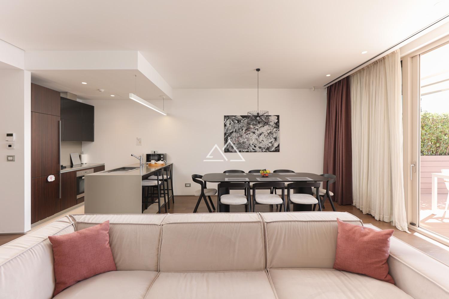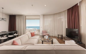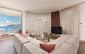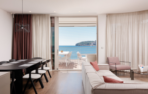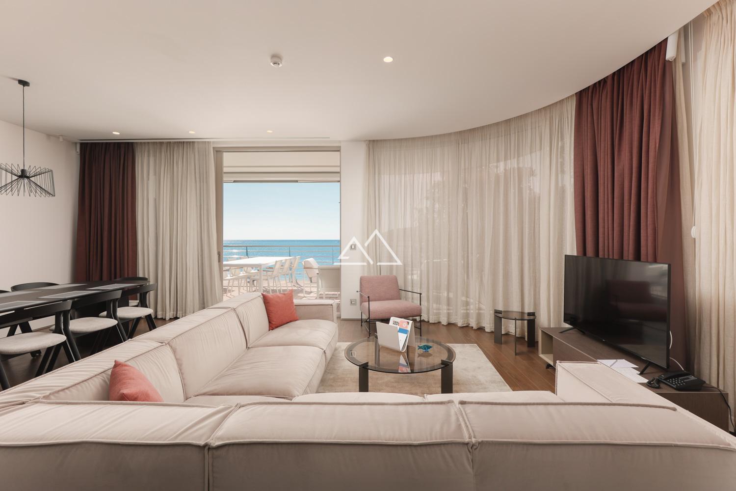 The apartment has spacious living room with kitchen and dining area, three bedrooms, two bathrooms, and big terrace overlooking the sea. Panoramic windows offer fantastic scenery views.